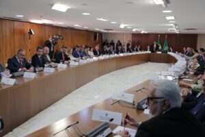 O governador Wilson Lima participou, em Brasília (DF), do encontro que reuniu governadores de 26 estados e do Distrito Federal, nesta segunda-feira (09/01), um dia após as sedes dos três poderes da República serem alvos de ataque no domingo (08/01). Realizada no Palácio do Planalto, sede do Poder Executivo Federal, a reunião foi comandada pelo presidente Luiz Inácio Lula da Silva e contou com a presença dos presidentes e representantes dos demais poderes.